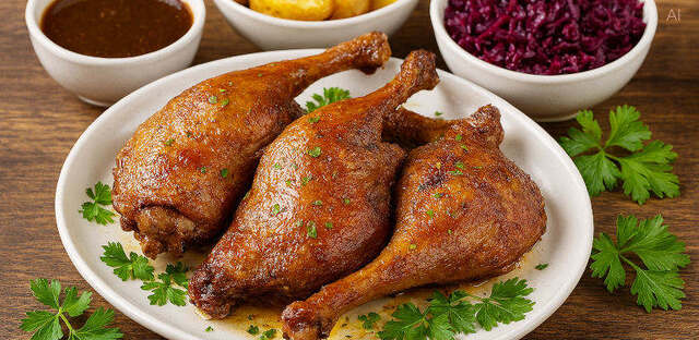 W zależności od regionu serwuje się ją z czerwoną kapustą, ziemniaczanymi knedlami lub świeżym chlebem.